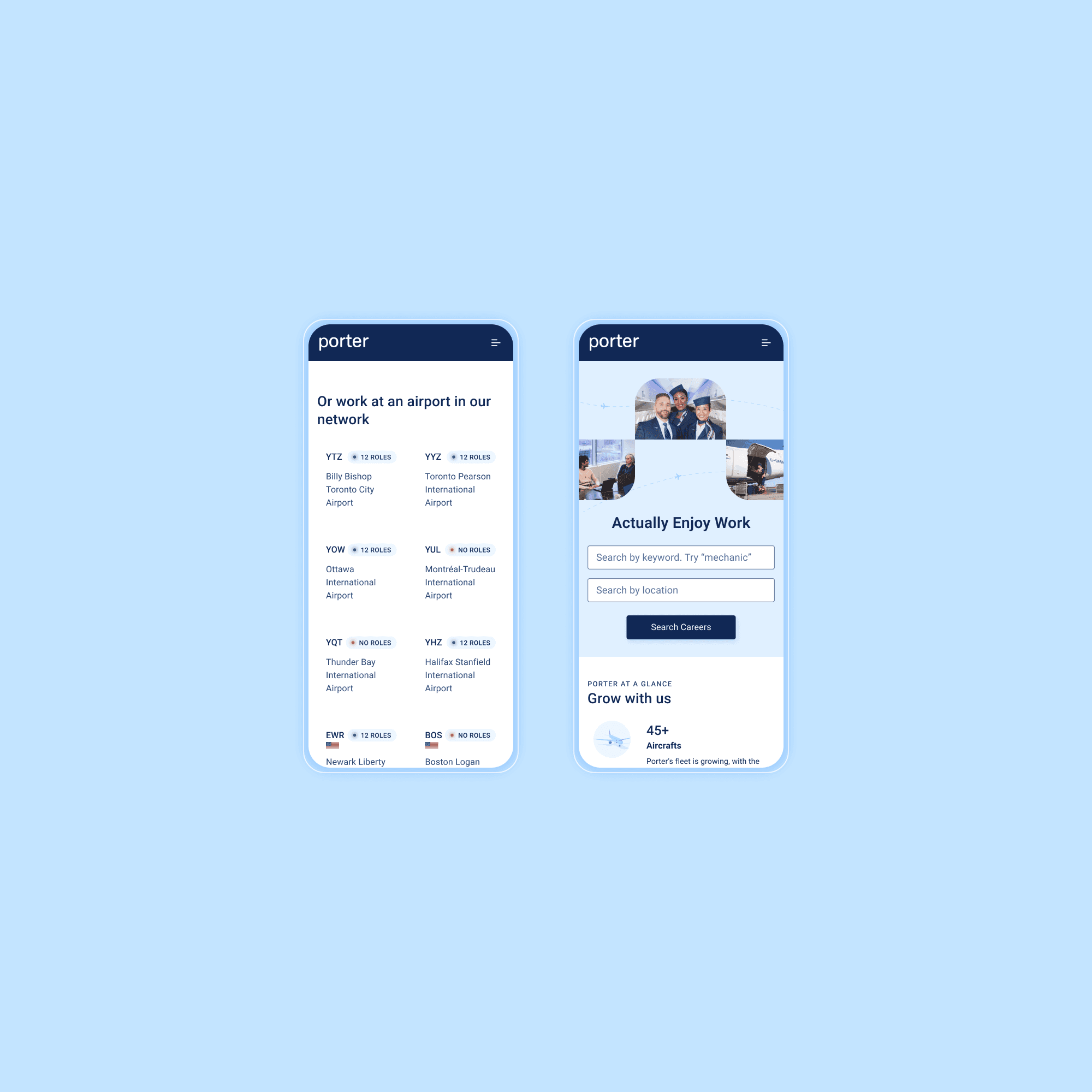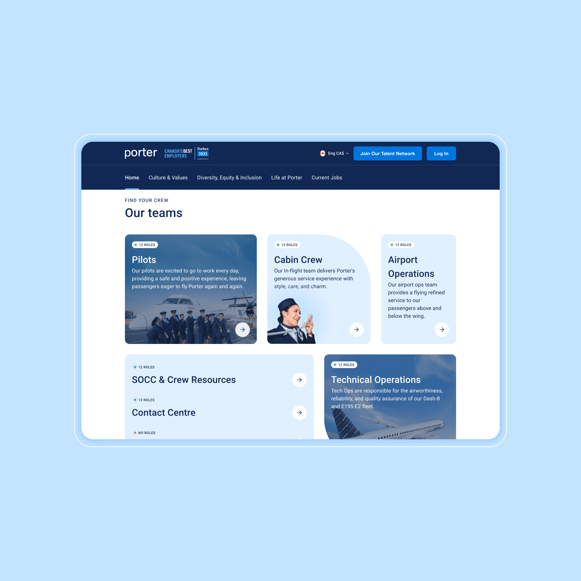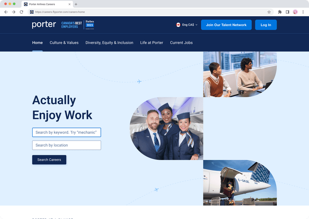 Porter Airlines is a Canadian carrier known for its refined economy experience and friendly, boutique-style service. As Porter Airlines expanded rapidly post-pandemic, the original Careers page didn’t reflect the company’s new growth and hiring needs. As the lead designer, I drove the vision and end-to-end design of the new Careers Hub, shaping its structure, guiding content, advising on accessibility and visual direction, and leading stakeholder alignment across people & culture, marketing, and our external development partner. We transformed a basic listings page into a confidence-building, content-rich multi-page microsite that celebrates culture, supports applicants, and attracts top talent.