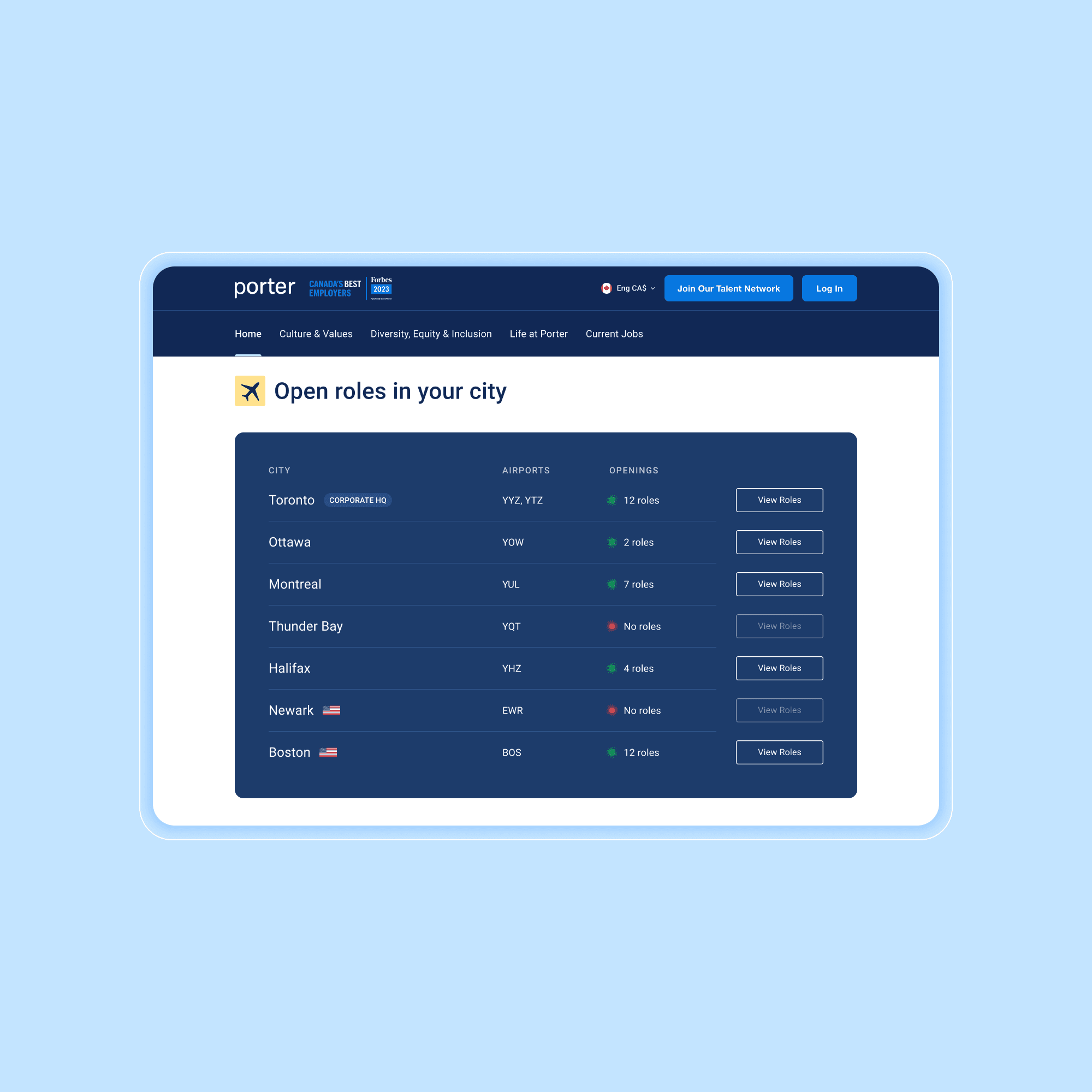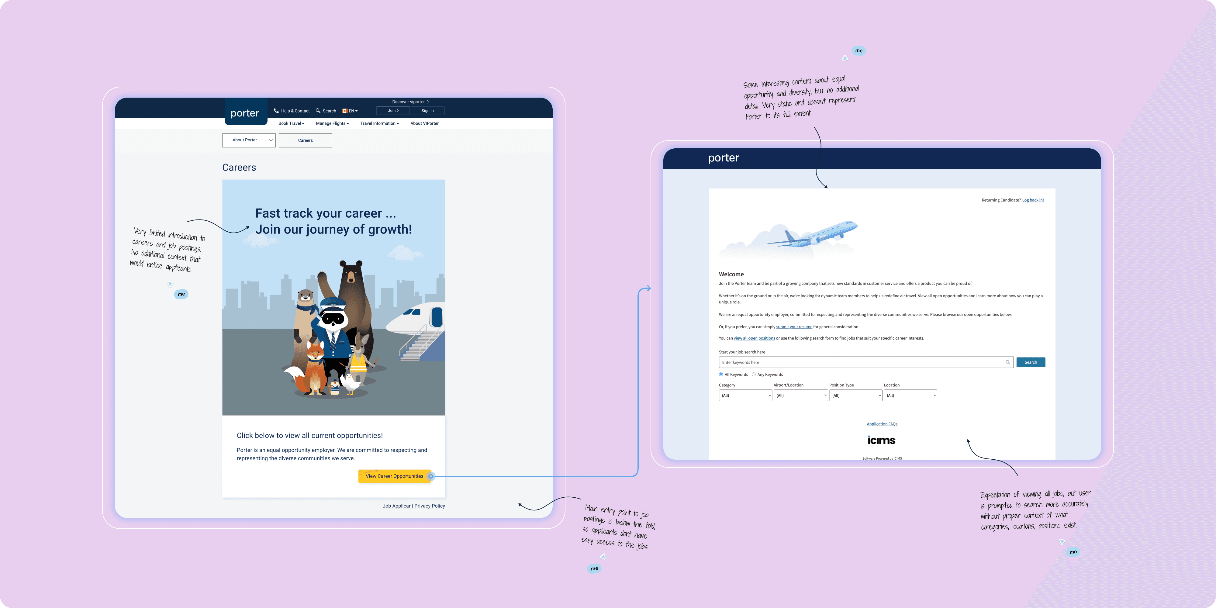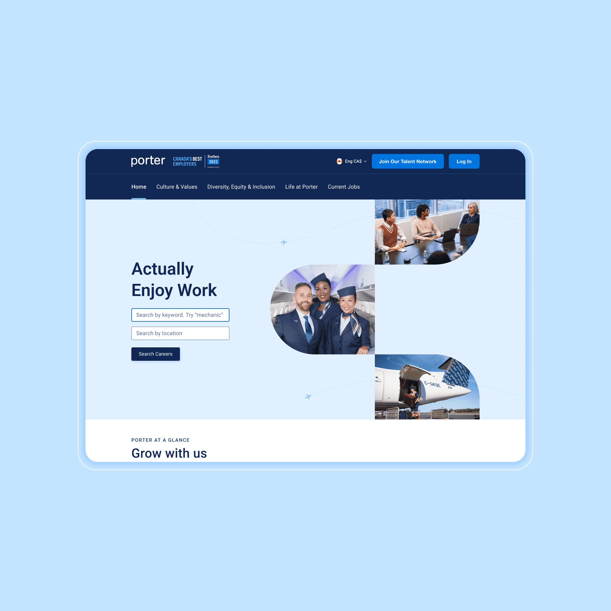 Porter Airlines is a Canadian carrier known for its refined economy experience and friendly, boutique-style service. As Porter Airlines expanded rapidly post-pandemic, the original Careers page didn’t reflect the company’s new growth and hiring needs. As the lead designer, I drove the vision and end-to-end design of the new Careers Hub, shaping its structure, guiding content, advising on accessibility and visual direction, and leading stakeholder alignment across people & culture, marketing, and our external development partner. We transformed a basic listings page into a confidence-building, content-rich multi-page microsite that celebrates culture, supports applicants, and attracts top talent.