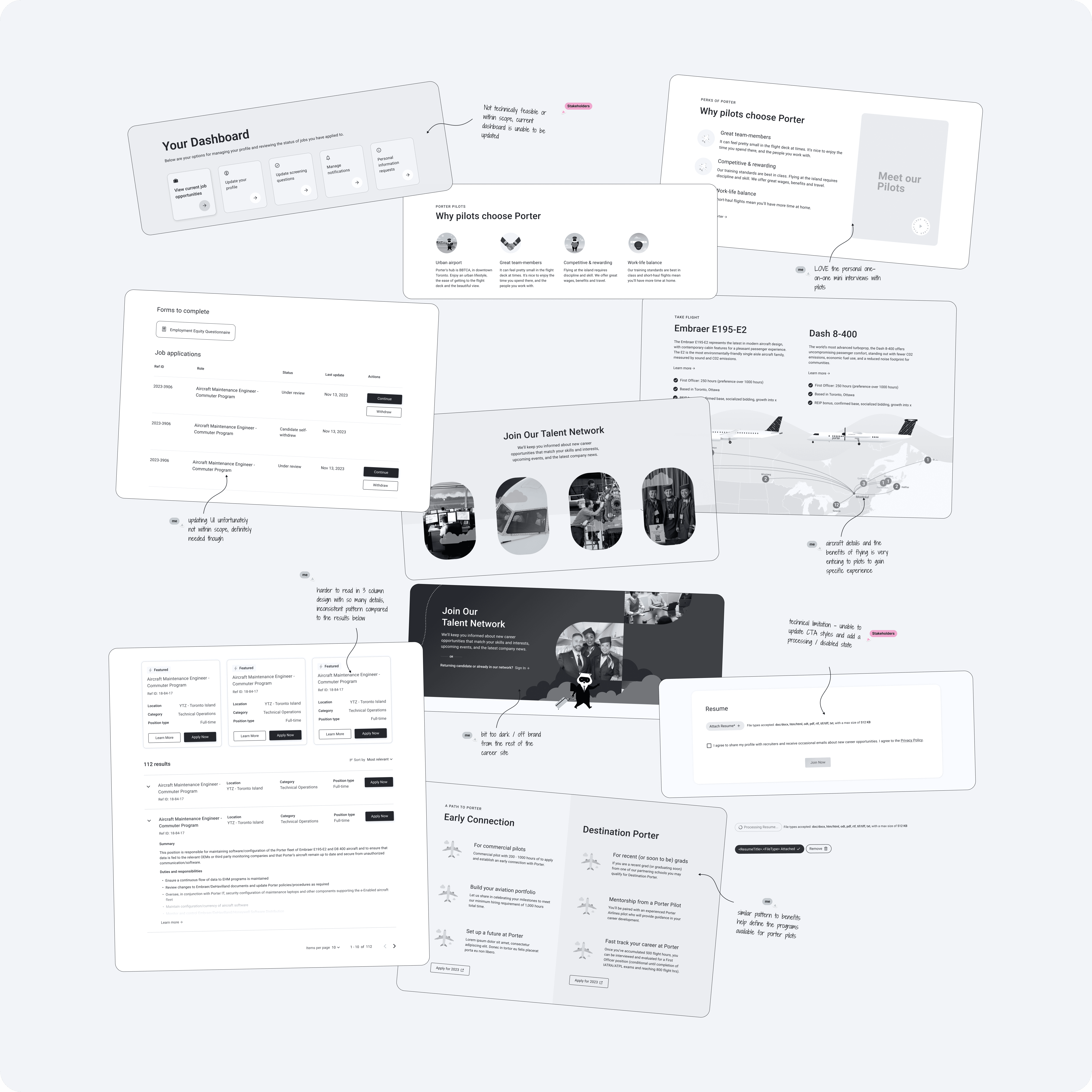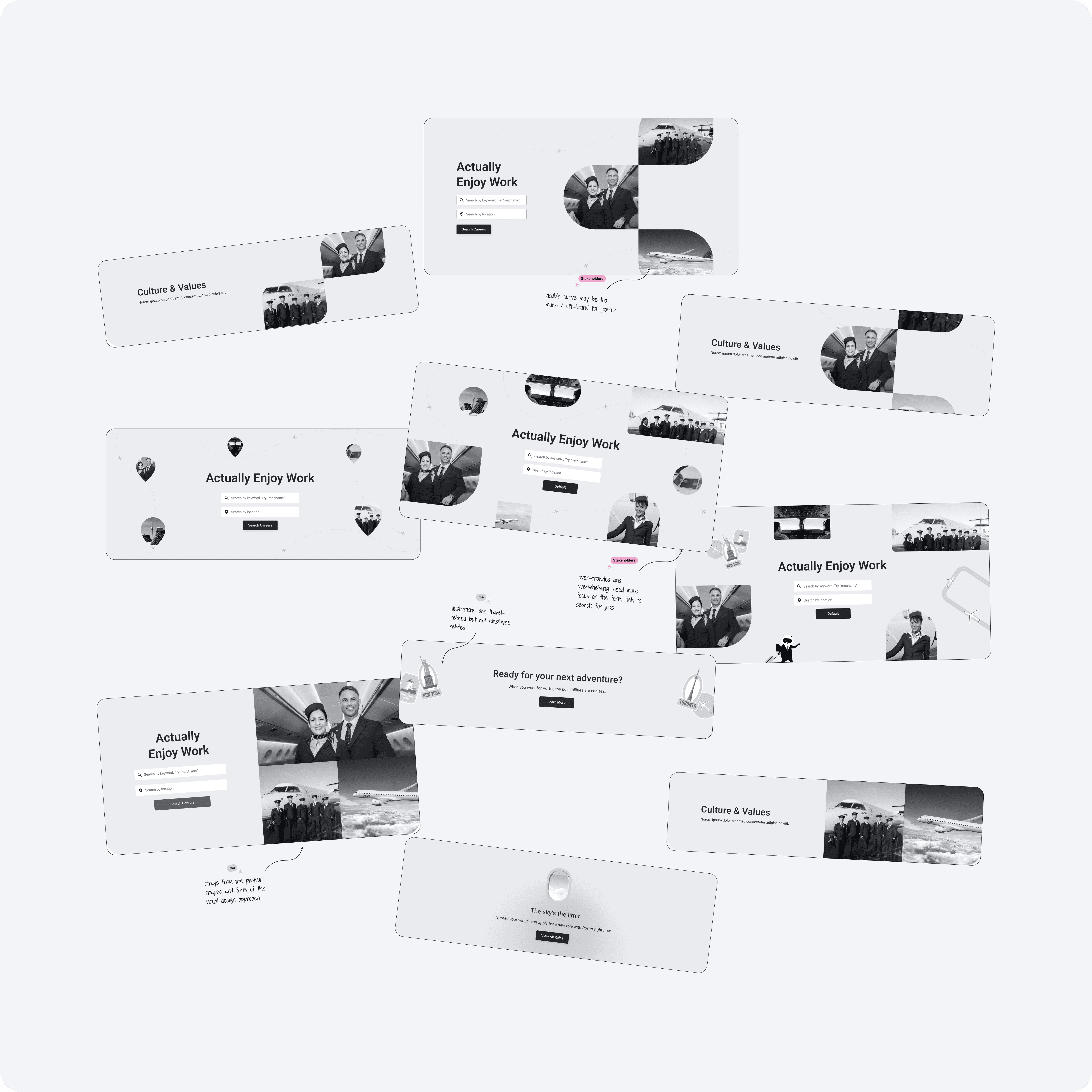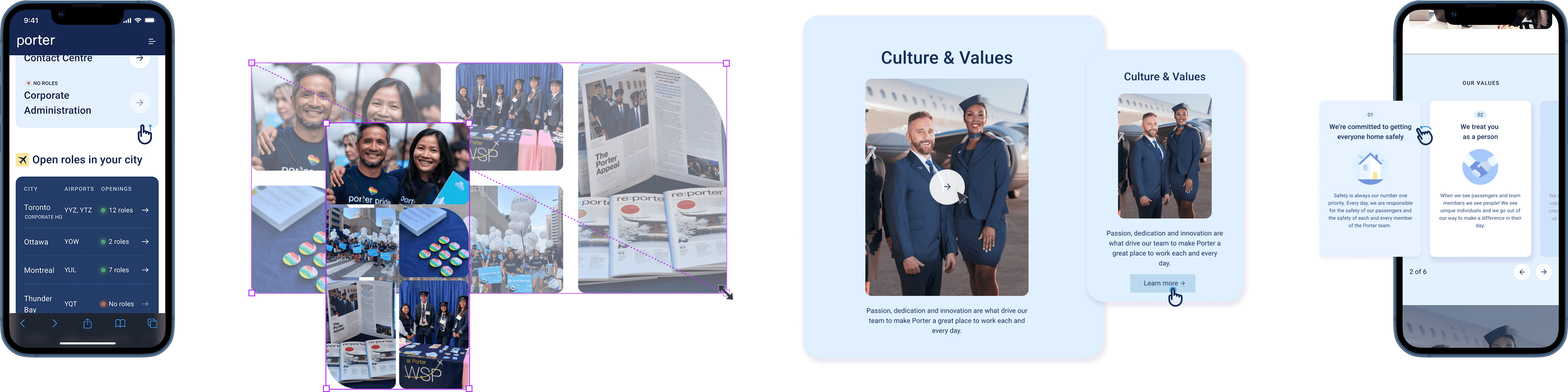 Though part of the Porter brand, the Careers Hub had a distinct goal: building trust and confidence for job seekers rather than inspiring travel. I developed a tailored brand direction using playful UI shapes to echo Porter without overusing illustration, vibrant candid imagery of team members to create a welcoming tone, and behind-the-scenes artifacts reflecting crew culture. This visual plan was shared early with content, UI, marketing, and People & Culture teams to align on tone and messaging, guiding consistent design decisions throughout the project.