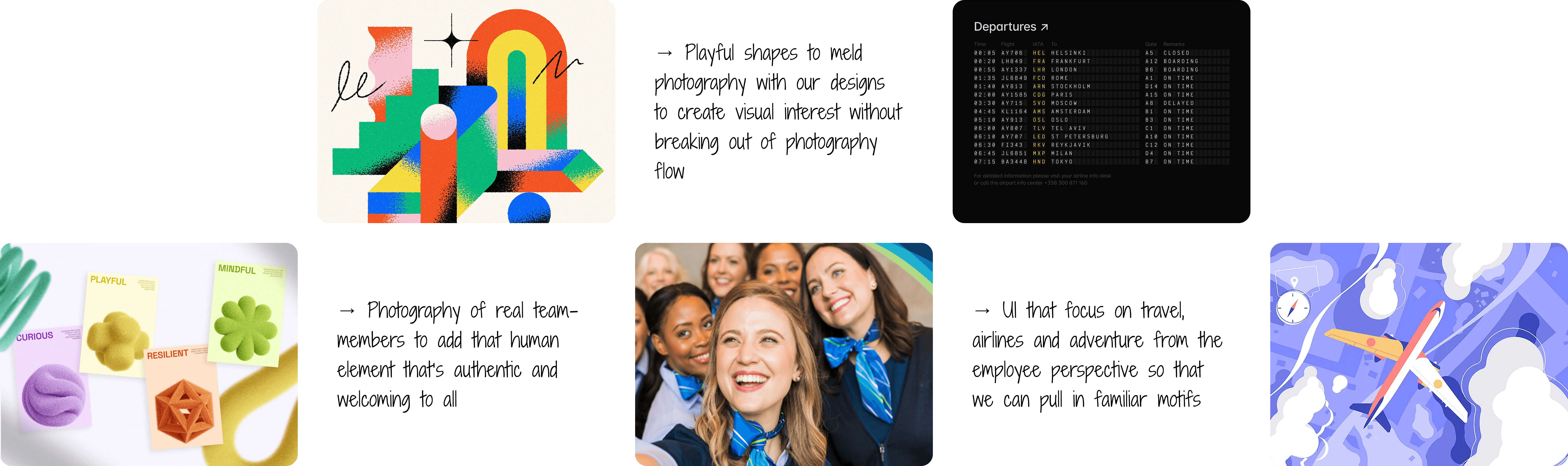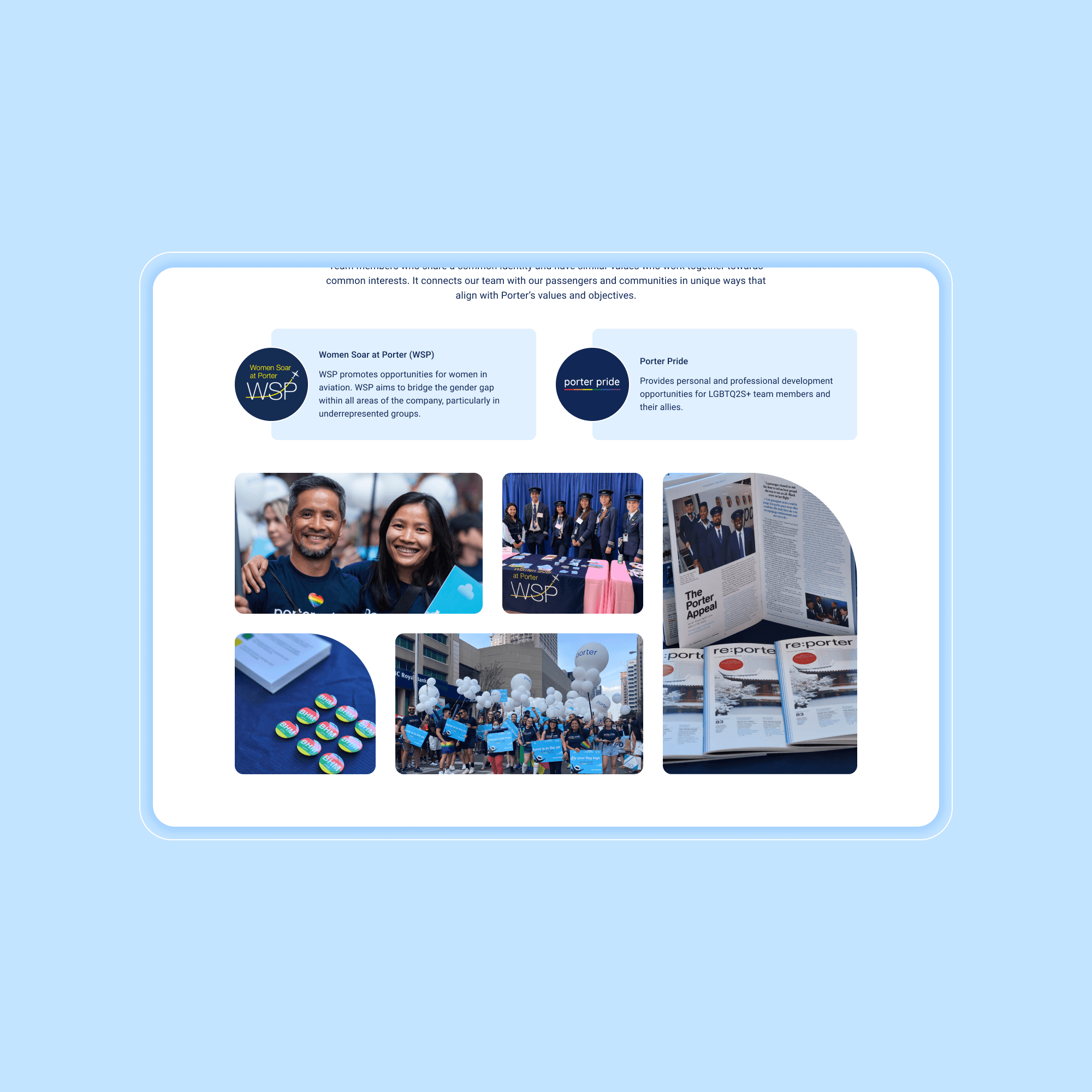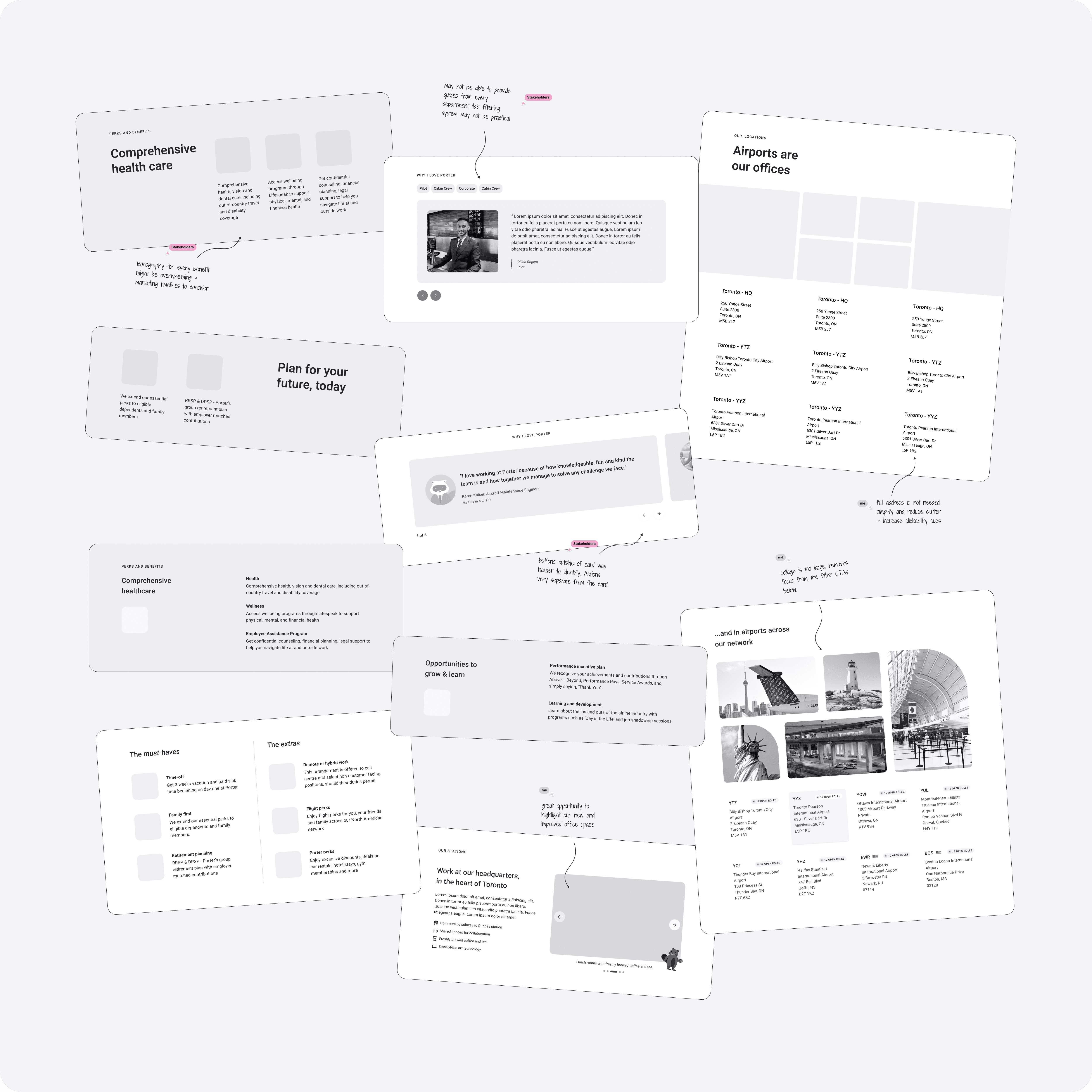 Though part of the Porter brand, the Careers Hub had a distinct goal: building trust and confidence for job seekers rather than inspiring travel. I developed a tailored brand direction using playful UI shapes to echo Porter without overusing illustration, vibrant candid imagery of team members to create a welcoming tone, and behind-the-scenes artifacts reflecting crew culture. This visual plan was shared early with content, UI, marketing, and People & Culture teams to align on tone and messaging, guiding consistent design decisions throughout the project.