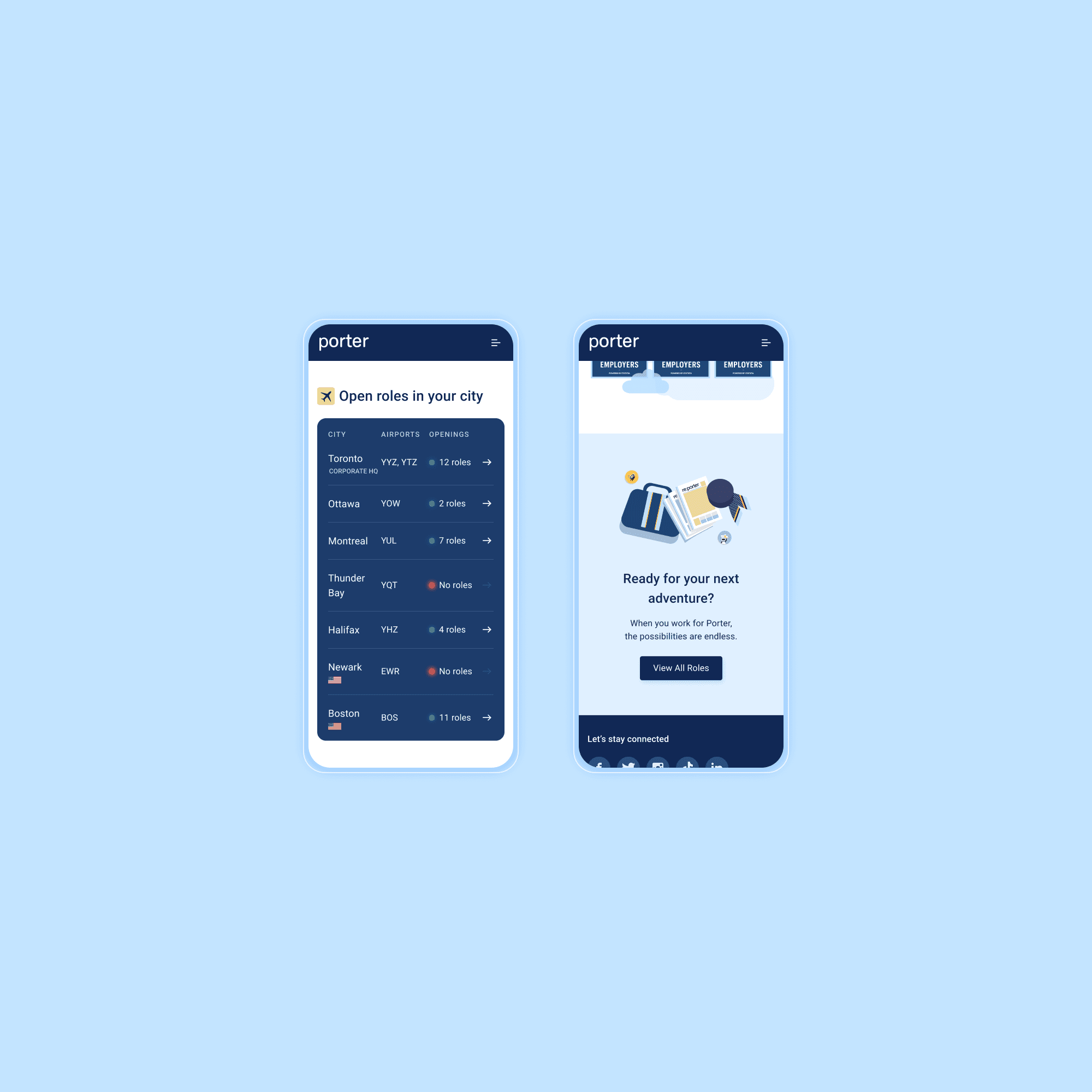 When Porter returned to service in 2021, it was expanding quickly. The original Careers page listed available jobs but offered little insight into culture, growth, or values, making it hard for applicants to feel confident or inspired, especially in a post-COVID job market. Our key goal was to support large-scale hiring with a site that inspires and attracts talent, communicates credibility, and reflects Porter's culture.