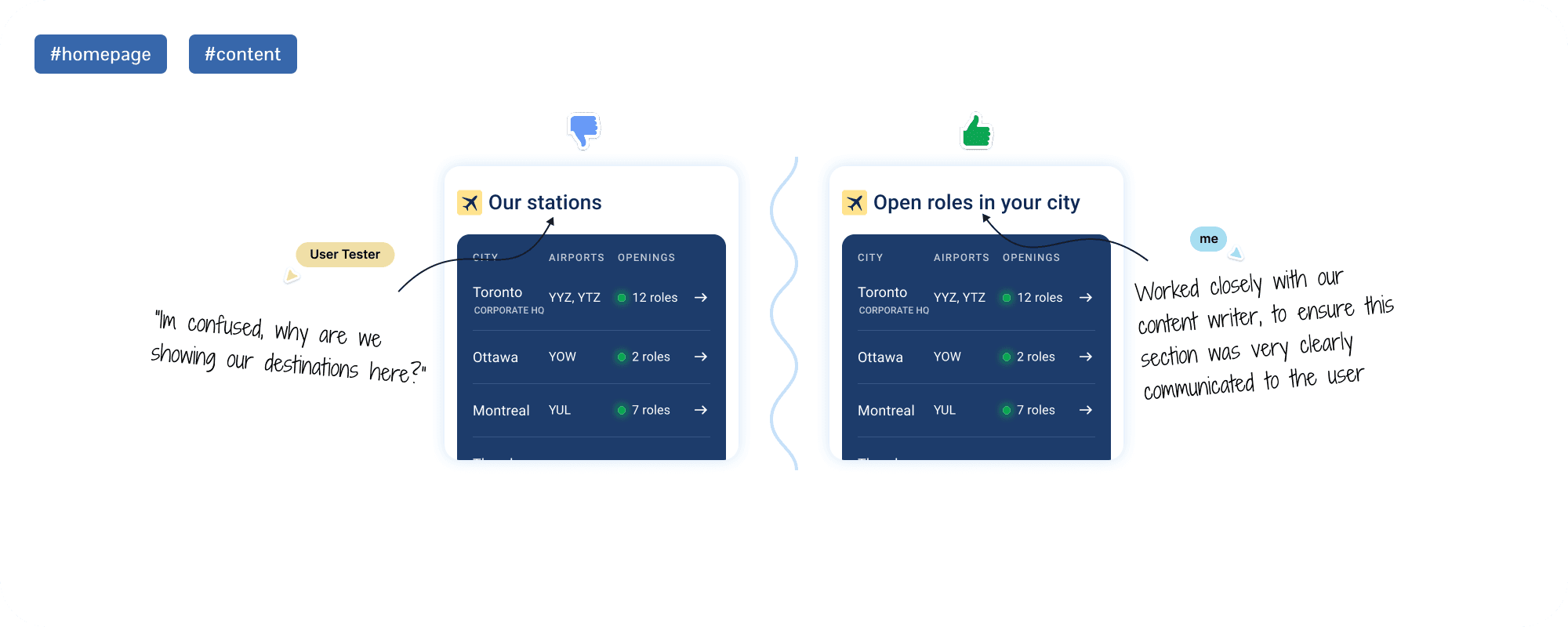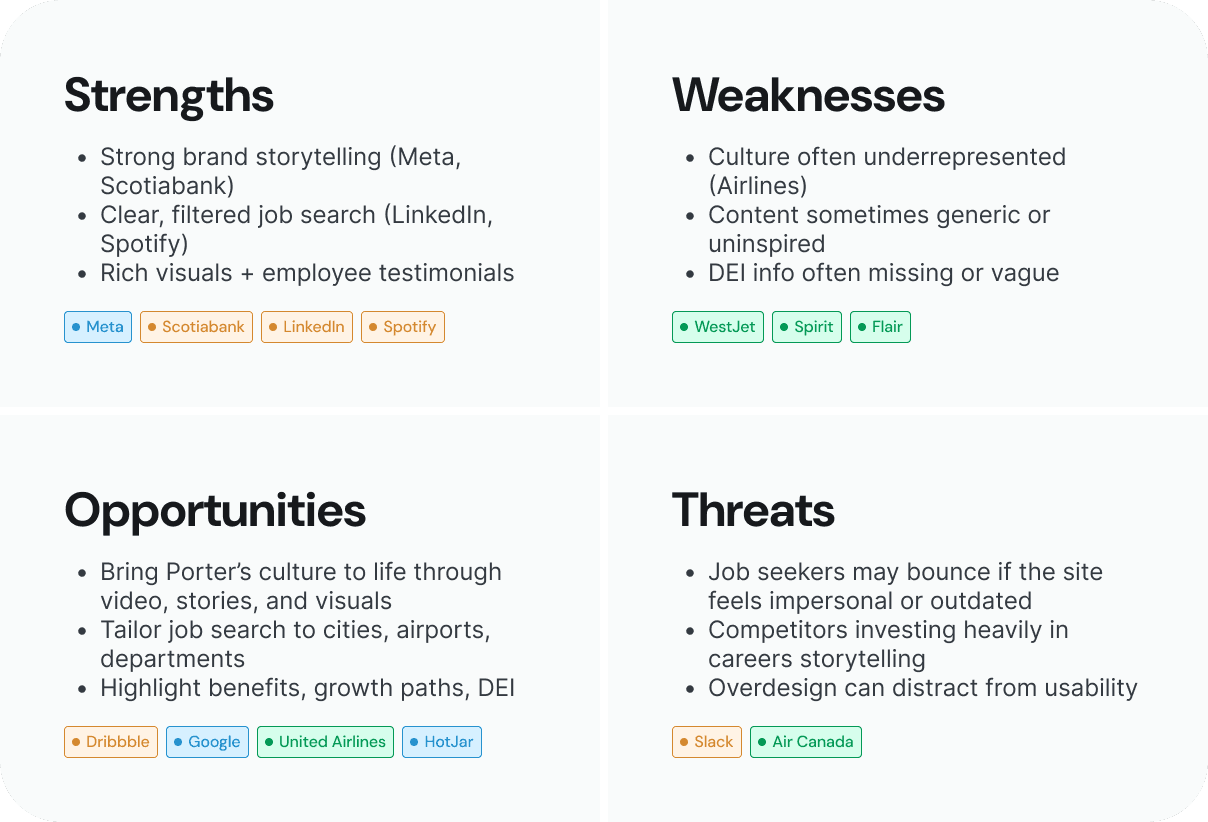 Because the Careers Hub had a different purpose than our passenger-facing pages, I ran a competitor analysis to see how other airlines, tech companies, and design-forward brands showcase culture, support job discovery, and keep applicants engaged. Reviewing examples from Air Canada to Google to Airbnb helped shape the structure and tone of our Careers Hub, grounding it in clarity, authenticity, and excitement.