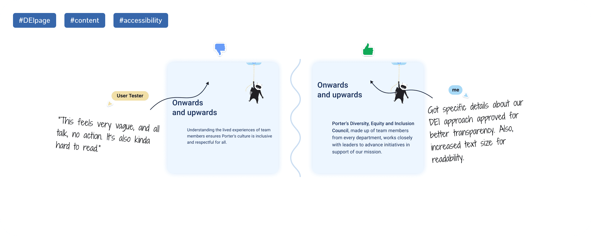 Separate Culture & Values and DEI into their own pages, while keeping job discovery and team overviews on the homepage to ensure we could highlight diversity initiatives and team overviews were reviewed by all.