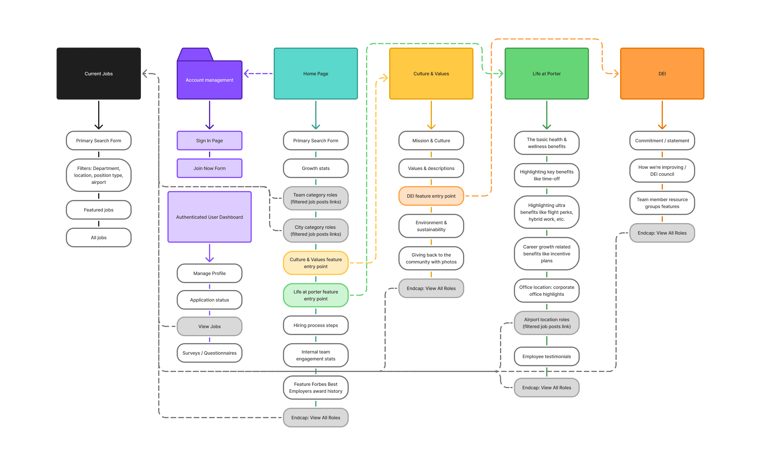 Prioritize four core pages for launch: Home, Culture & Values, Life at Porter, and Diversity & Inclusion, with a dedicated “Teams” or “Pilots” page planned for a future release.